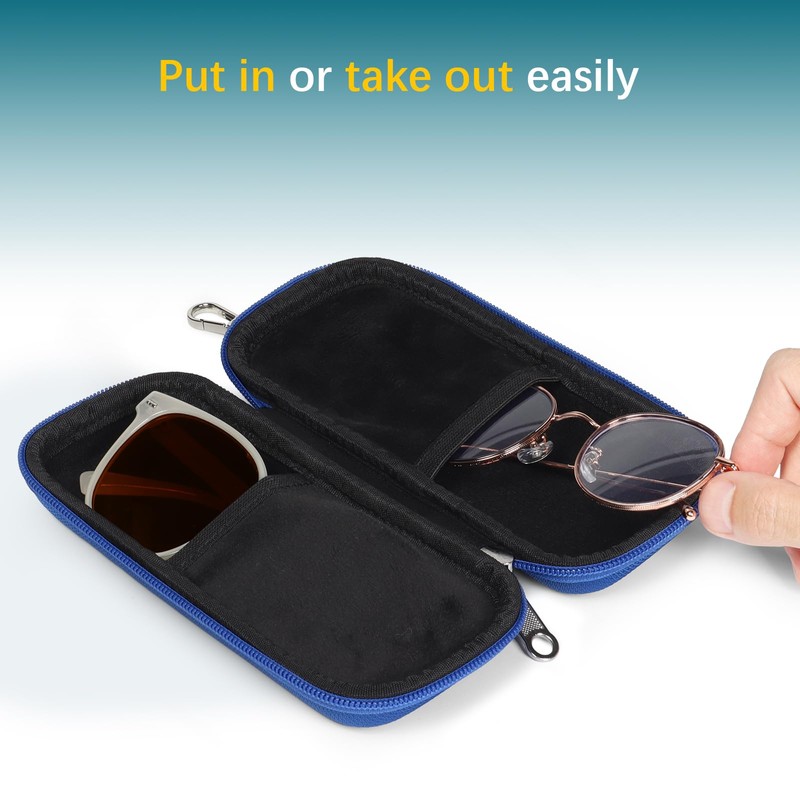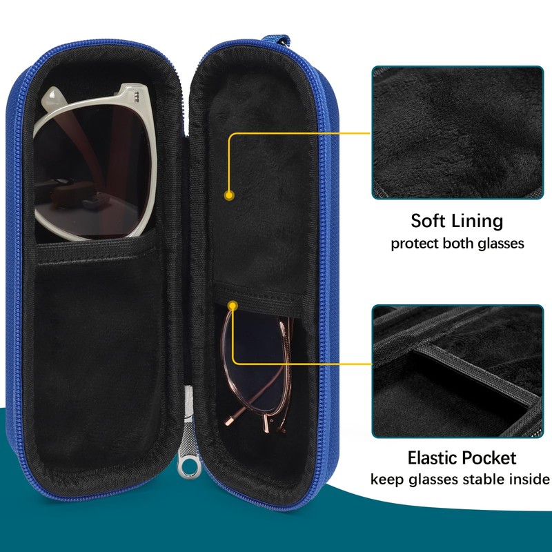 - PROTECTIVE DESIGN: With Rubber band designed to keep glasses stably inside. Soft-lined pockets protect glasses individually from scratches.Hard shell eyeglass case with zipper closure provides maximum protection for your glasses or sunglasses. And the soft lining also keeps your eyeglasses from scratching. Soft fabric lining interior prevents scratches while elastic strap securely holds eyewear in place. Full protection for your double glasses
