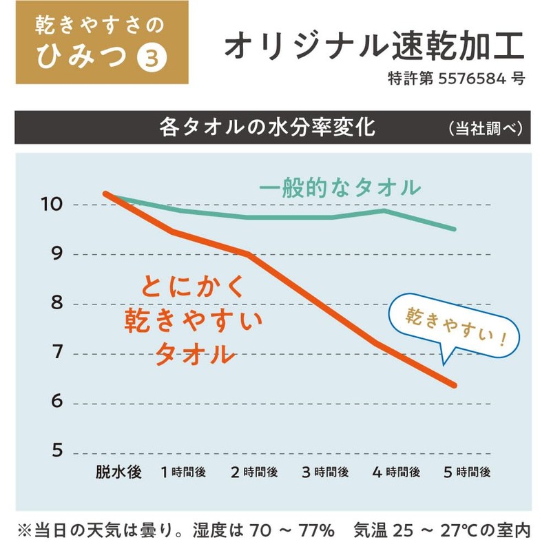 - (Safe and Quick Drying Even in Winter) This 106% cotton towel is made with a focus on drying time in snowy days or winter with bad weather. It does not lose the amount of water absorption and dries faster after washing and leaves less water remaining on the towel fabric