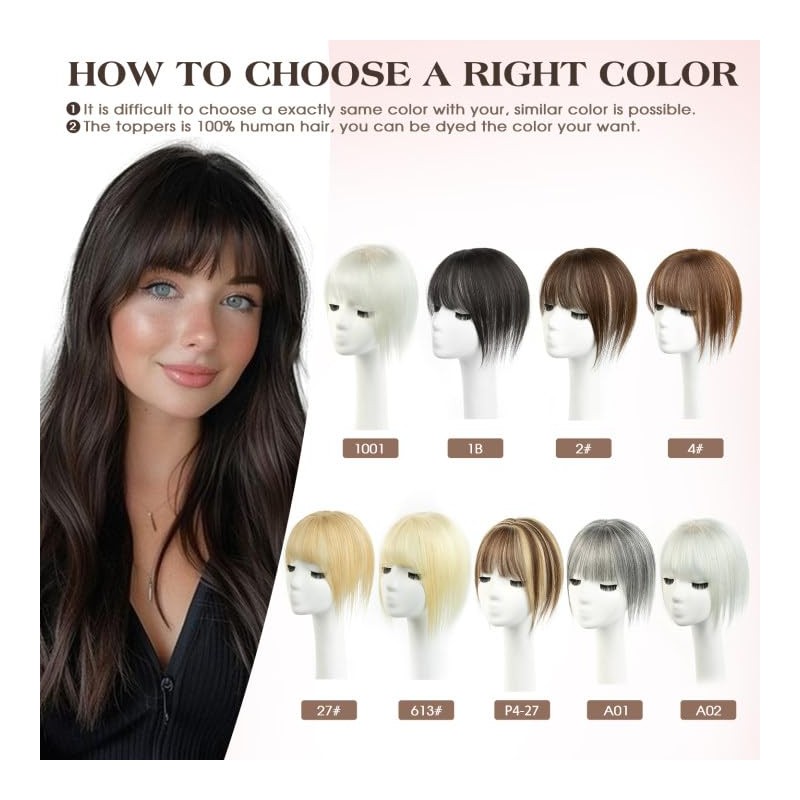 - Multi-function:This hair topper is the perfect choice for women with thinning hair. Human hair topper with bangs hair clip will add hair volume, cover gray hair ,slight bald head,& lose hair, It can effectively shape your face. Bring you new fashion hair style and confidence.