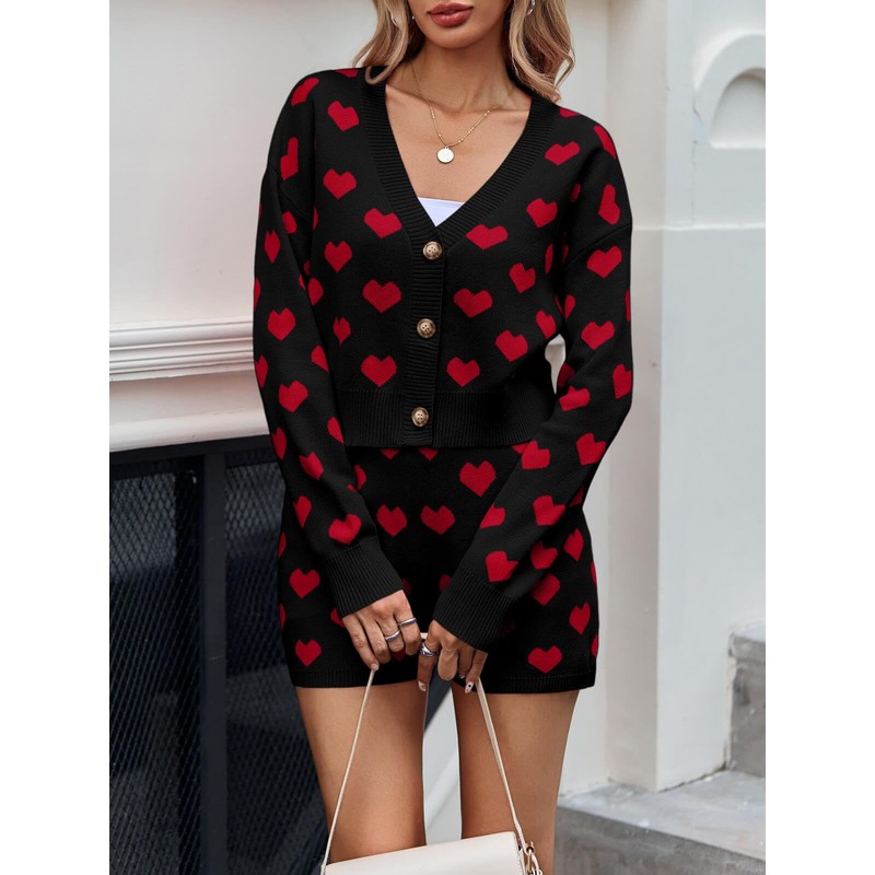 Tankaneo Tankaneo Womens Valentine's Day Sweater Sets Heart Knit Long Sleeve Cropped Cardigan and Shorts 2 Piece Outfits