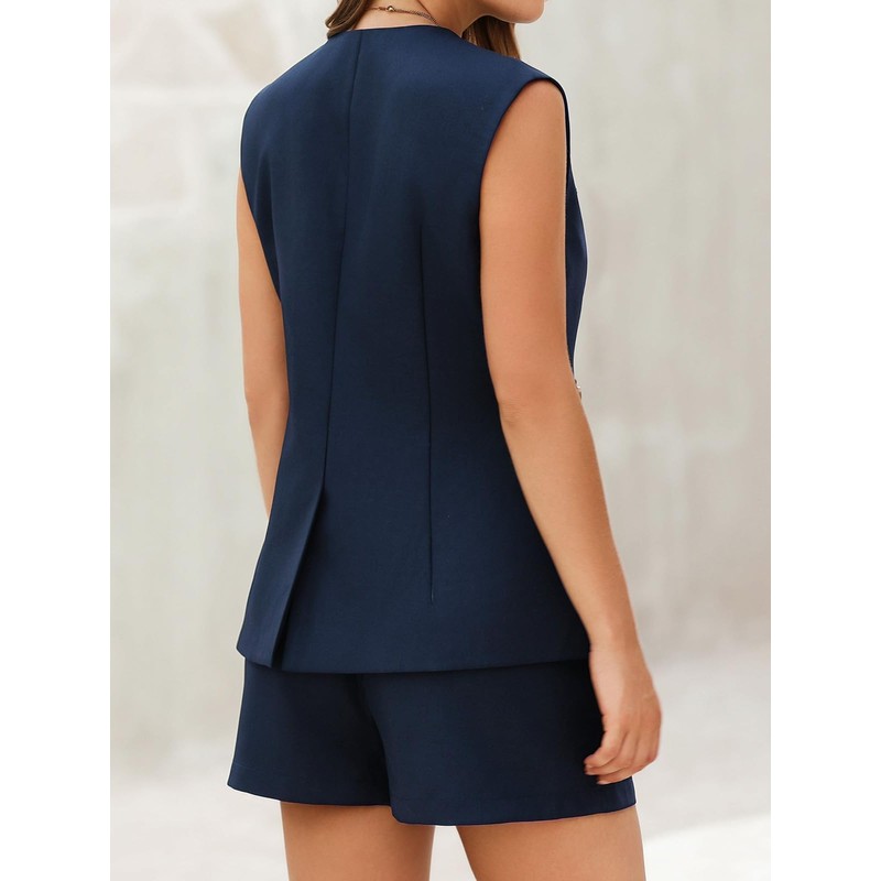 Tankaneo Womens 2 Piece Outfits Casual Suit Sets Sleeveless Button Down Blazer Vest Shorts Office Business Matching Set, Navy, Large