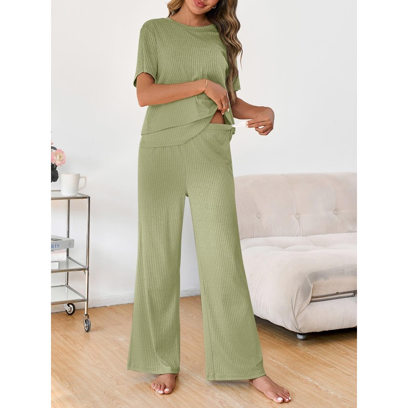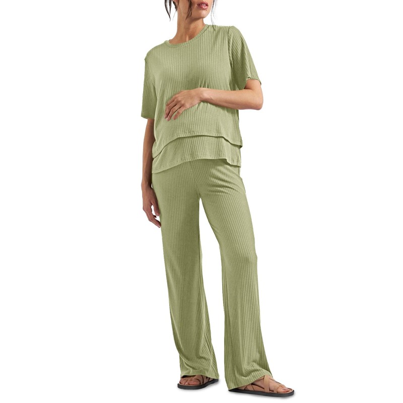 Tankaneo Womens Postpartum Maternity Pajamas 2 Piece Sets Rib Short Sleeve Nursing Tops and Elastic Waist Pants Loungewear, Army Green, Large