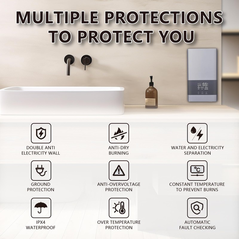 - 【Anti-Electric Wall Protection】Leakage detection protection, which means that the hot water heater will automatically cut off the power supply when it detects leakage.