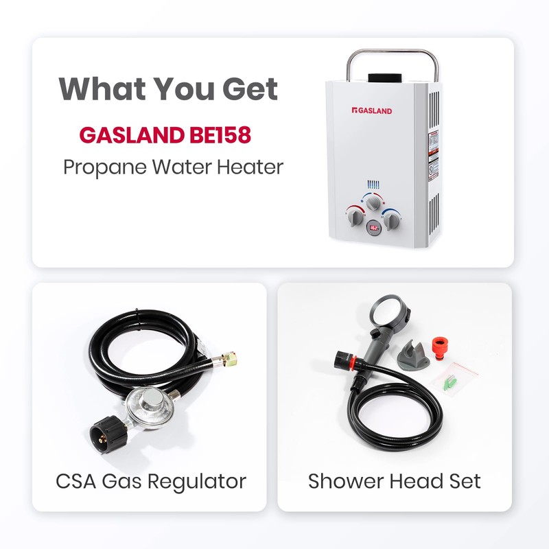 - ๐ช๐ต๐ฎ๐'๐ ๐๐ป๐ฐ๐น๐๐ฑ๐ฒ๐ฑ - GASLAND BE158 Tankless Water Heater, CSA certified gas regulator and hose,5 feet On/Off Switch Shower Head, mounting hardware, garden hose adapter, Manual.