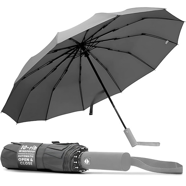 TANNESS Windproof Umbrella β 10-Rib Waterproof & Compact Umbrella with Automatic Open/Close Function and Ergonomic Handle β Folding Mini Umbrella - Strong Umbrellas for Wind and Rain (Grey)