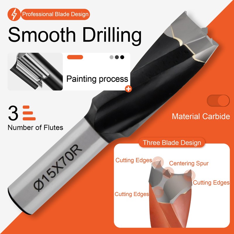 TANOMATE 15mm Diameter Carbide 3 Flute Drills Brad Point Boring Bit, 15mm Dia × 70mm Long × 10mm Shank Right Hand