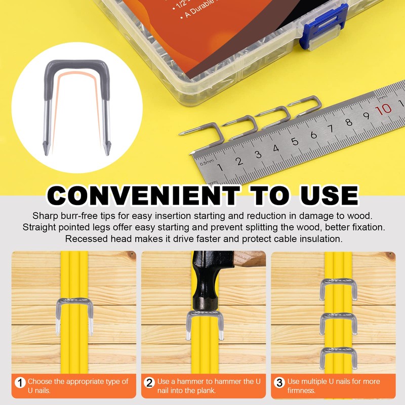 - √[APPLICATIONS]: U nail is very suitable for fixing wires and cables around the house. when they are hammered into wood, the coating can't come off easily and won't damage your hammer.