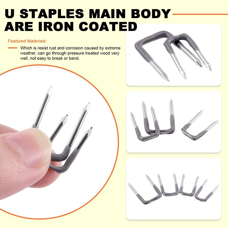 - √[DURABLE MATERIAL]: The U staples main body are made of carbon steel, resist rust and corrosion caused by extreme weather, can go through pressure treated wood very well, not easy to break or bend. At the bottom unichrome plating insulating polyvinyl chloride, can prevent scratching the wire and protect cable. Quality guaranteed and your best choice for your home repair works.
