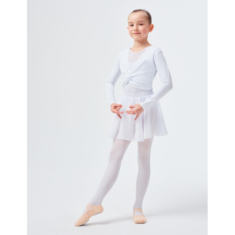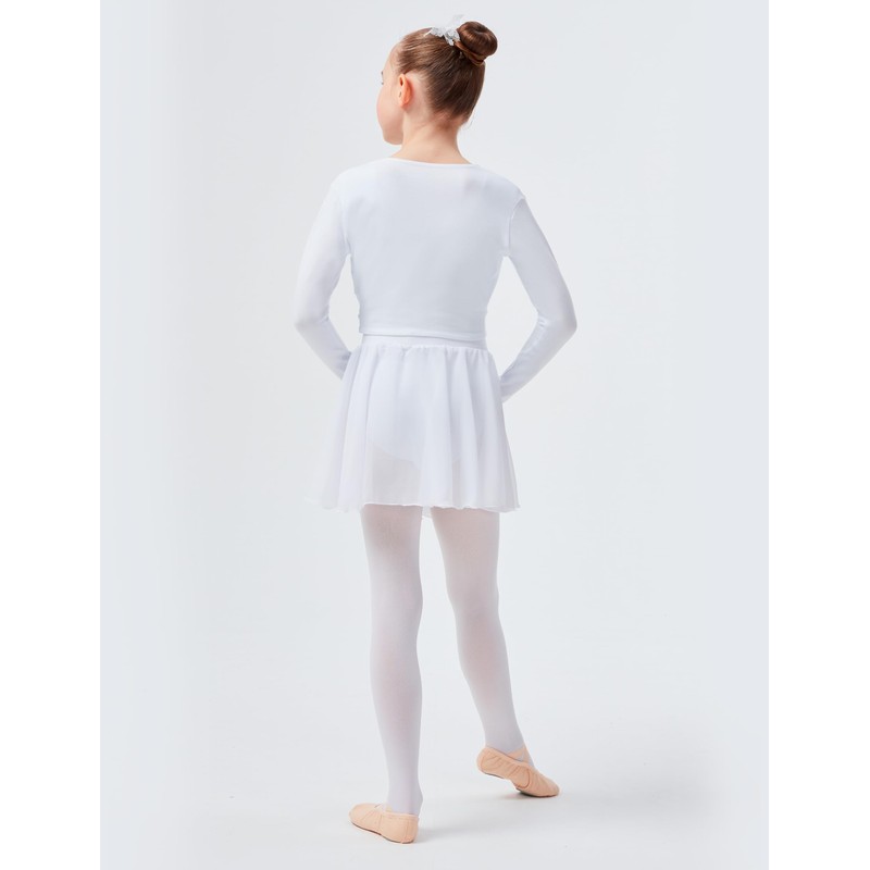 The wrap-around top made of soft and strong cotton blend fabric is ideal for wearing during the warm-up phase in ballet lessons, on cooler days or simply in the training break. It perfectly completes a ballerina outfit when combined with a short-sleeved or strappy leotard or dress.