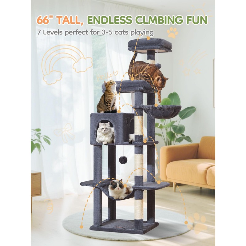 Taoqimiao MS042G Cat Tree,66-inch Large Cat Tower with Scratching Posts, Luxurious Large Platform for Big Cats with Soft Hammock, Adjustable Basket, Deluxe Cat Cando, Top Perch Smoke Gray