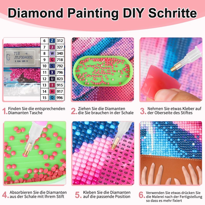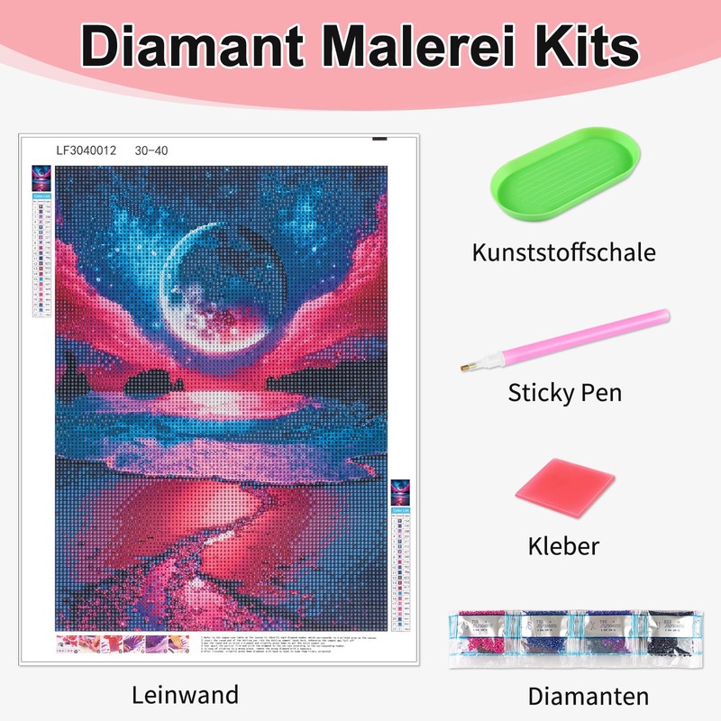 - Practical diamond painting kits: each diamond painting comes with everything you need, including 1 x HD diamond painting canvas, 1 x diamond pen, 1 x cube-shaped diamond tray, 1 x red glue clay, 1 x pen handle and enough colourful round diamonds.