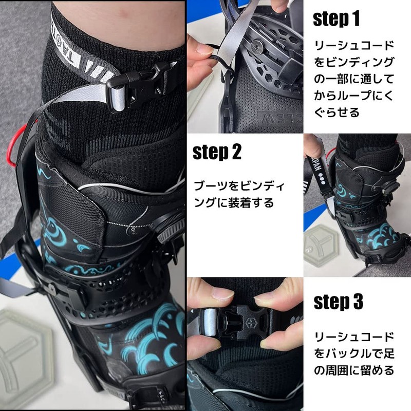 - バインディングに装着してからブーツを固定し、リーシュを足に付けます。