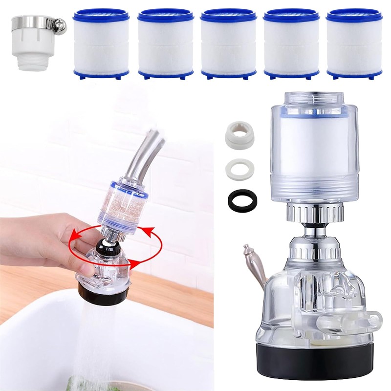 - Package includes: 1 × 360° filter taps (long); 5 × PP cotton filter cartridges; 1 x universal connectors; faucet filter gasket.