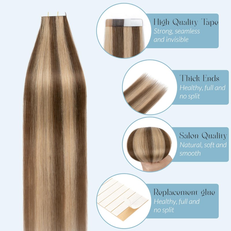 - Super strong invisible tape: the real hair extension is made of improved, high-strength double-sided white adhesive, which is ultra-thin, invisible and hypoallergenic. After light heating, it becomes more sticky and durable. You can apply and remove our hair extensions in just a few minutes. Replacement bands are included for reuse.