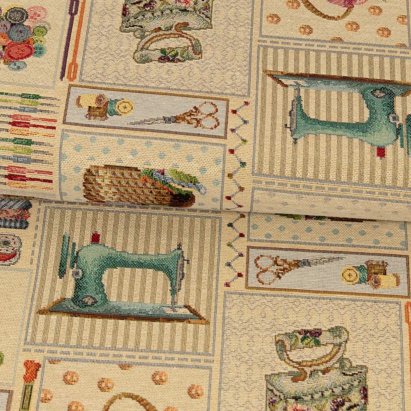 Sewing machines, irons, tailor's doll, wool baskets, thimbles, buttons and many other sewing tools are available in beautiful colours on this great tapestry! The tapestry fabric is used for interior fittings, such as covers for chairs and sofas, as stylish cushion covers, bedspreads and for heavy curtains. Thanks to its easy handling, the tapestry fabric is also suitable for handbags, coats, jackets and vests or even for women's skirts.