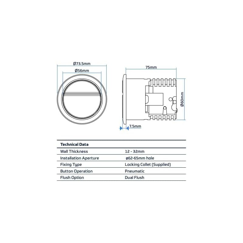 The Thomas Dudley Geo Dual Flush WC button combines elegant design with practical functionality. This chrome-plated push button, measuring 73.5mm in diameter, offers a sophisticated dual flush operation that helps reduce water consumption. The smooth pneumatic mechanism ensures reliable performance and can be positioned up to 250mm from the cistern, offering installation flexibility. Specifically designed for Dudley concealed cisterns and Illision A and V frames, this button accommodates wall thicknesses from 12-32mm and requires a 62-65mm installation aperture. The button comes with a supplied locking collet for secure fitting. Its sleek chrome finish and circular design make it a stylish addition to any bathroom, while the split-button interface clearly indicates the dual flush options. Compatible with standard installations, this button exemplifies modern bathroom technology with its precise engineering and premium finish.