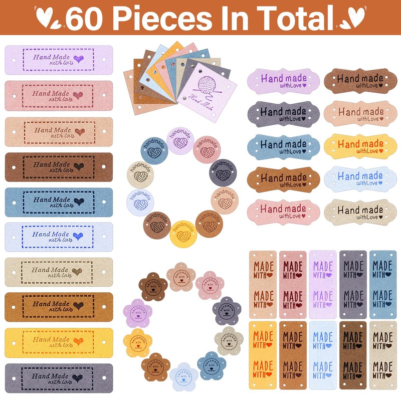 Tapvai Handmade Label for Sewing, Pack of 60, Labels for Sewing, PU Leather, Label Handmade, Handmade Label with Rivets with Holes for Crochet Clothing, Knitting, DIY Jeans, Bags, Hats (6 Styles 10