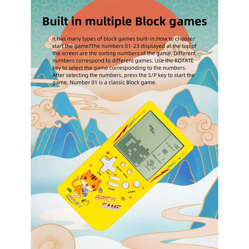 - Multiple block games integrated: many types of block games are integrated. How to choose the game and start it? The numbers 01-23 displayed at the top of the screen are the sorting numbers of the game. Different numbers correspond to different games. Use the ROTATE button to select the game that corresponds to the numbers. After selecting the numbers, press the S/P button to start the game. Number 01 is a classic block game.