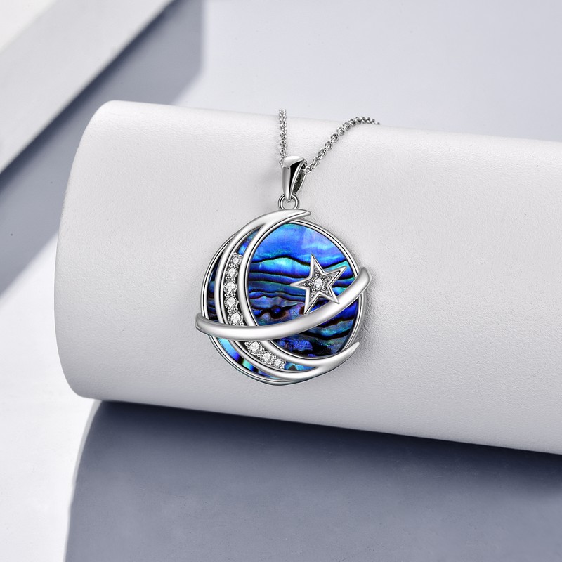 - Sterling silver pendant in the shape of a star and moon, with a Saturn-shaped abalone shell in the center