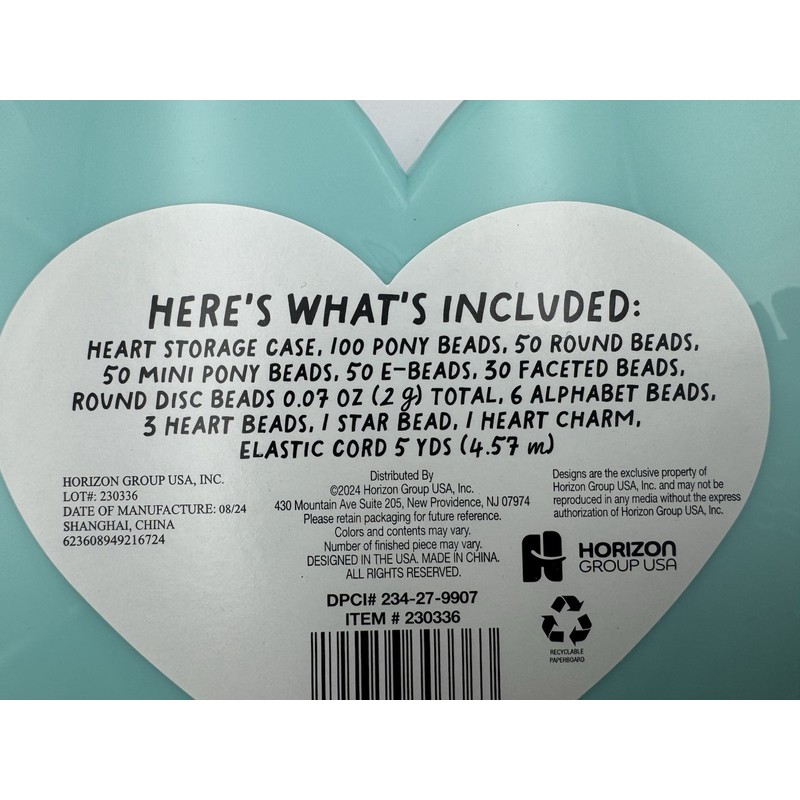 Heart storage case, 100 Pony beads, 50 round beads, 50 mini pony beads, 50 E-beads, 30 faceted beads, round disc beads, 6 alphabet beads, 3 heart beads, 1 star bead, 1 heart charm, 5 yards of elastic cord