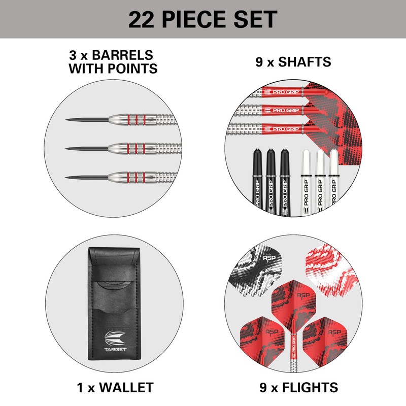 - ENDORSED BY NATHAN ASPINALL – Target Darts have worked in collaboration with the 2023 Matchplay Champion – Nathan “The Asp” Aspinall - to create this Tungsten dart set, offering radial grooved contours for excellent grip and a beautifully balanced experience for darts enthusiasts and players new to the sport. For complete peace of mind, all Target Darts barrels come with a lifetime guarantee. Barrel Length: 52mm, Barrel Diameter: 7.0mm (22G), 7.2mm (23G), 7.4mm (24G)