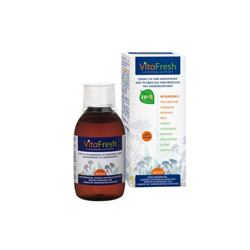 VITAFRESH is a syrup with natural flavor, for sore throat and for productive or dry cough. A food supplement to empower the immune system. Suitable for Adults and Children over 3 years old.
