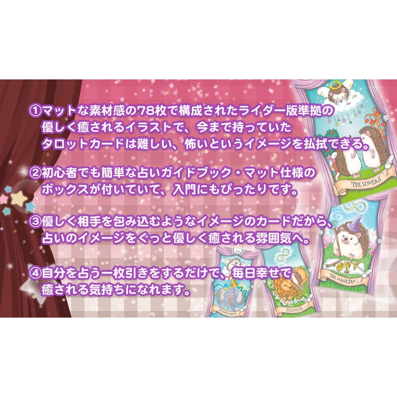 - A popular animal with loveable hedgehog. Even in the metropolitan area, it heals the hearts of many people while looking as small as a hedgehog cafe can. The cuteness of this hedgehog is packed into tarot cards in fairy tale world. This is the FABLE HEDGEHOG TAROT