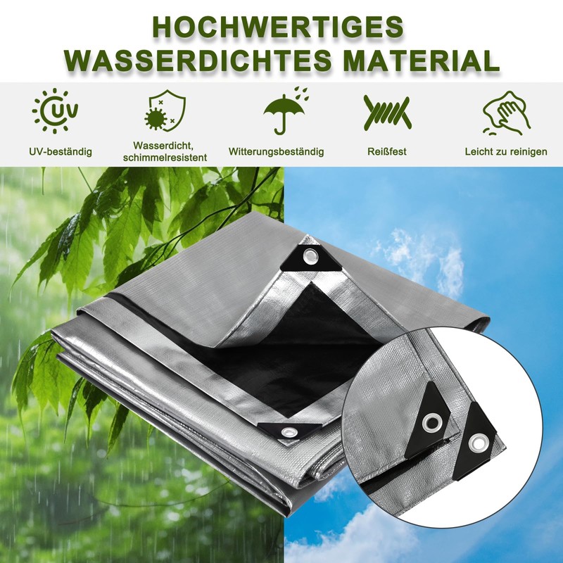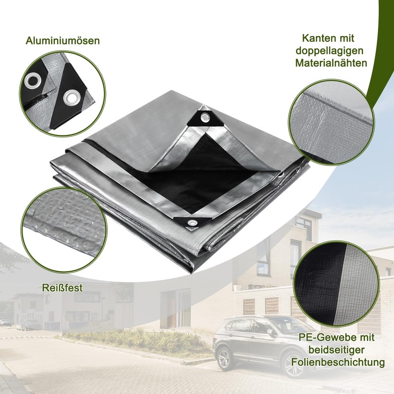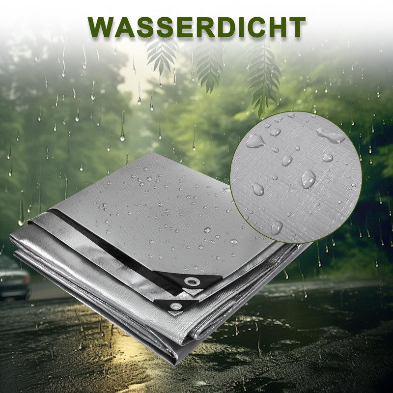 Durable and stable: the waterproof tarpaulin made of 180 g/m² PE fabric and is thanks to the reinforced corners with rubber edges and the double material sewn on all edges, the tarpaulin is extremely tear-resistant.