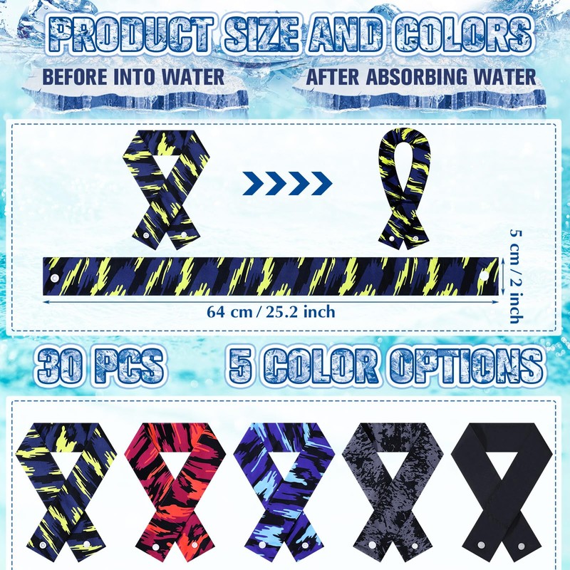 - Packing Included: you will receive 30 pieces of cooling scarves in 5 different camouflage styles, 6 of each color; Fashionable design and rich colors can meet your practical needs of daily use and replacement, you can share them with your family, friends and colleagues as presents
