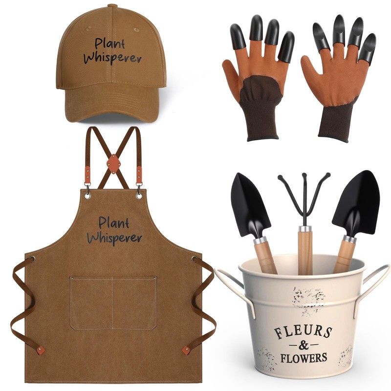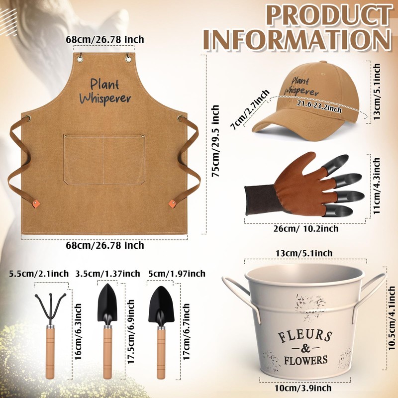- Complete 7-piece Gardening Kit: the brown garden tool kit includes 1 pcs garden apron, 1 pcs soil scoop, 1 pcs transplant trowel, 1 pcs cultivator, 1 pair of gardening gloves and 1 plant whisperer hat, 1 garden iron bucket; This is the good all-in-one gardening kit for those who love to grow