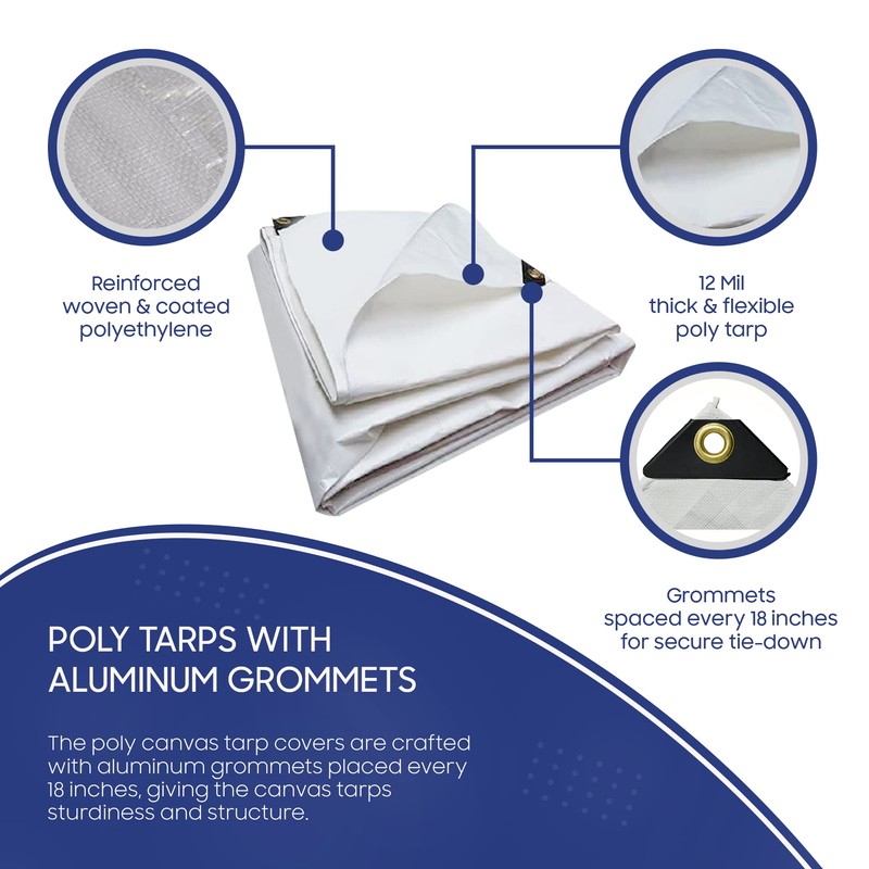- ALUMINUM GROMMETS: The poly tarp covers are crafted with aluminum grommets in the corners for secure tiedown and placed every 18 inches, giving the tarps sturdiness and structure.