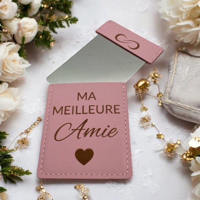 - Elegantes Design: Rosa Kunstleder-Taschenspiegel mit eingravierter Aufschrift "Ma mailleure Amie" für einen schicken und modischen Look.