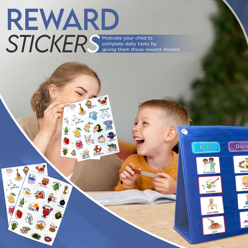 - 🌟 FEATURES & PACKAGE CONTENT : you will get 104 cards with moveable material that show a clear begening, middle and end in order to manage the routine. 4 sheets (80 cutes design) of punny reward stickers that serve as a form of positive reinforcement and celebrating the child's accomplishments and efforts. 27 communications flashcards for children with special ed or speech delay. a done pocket for completed tasks.
