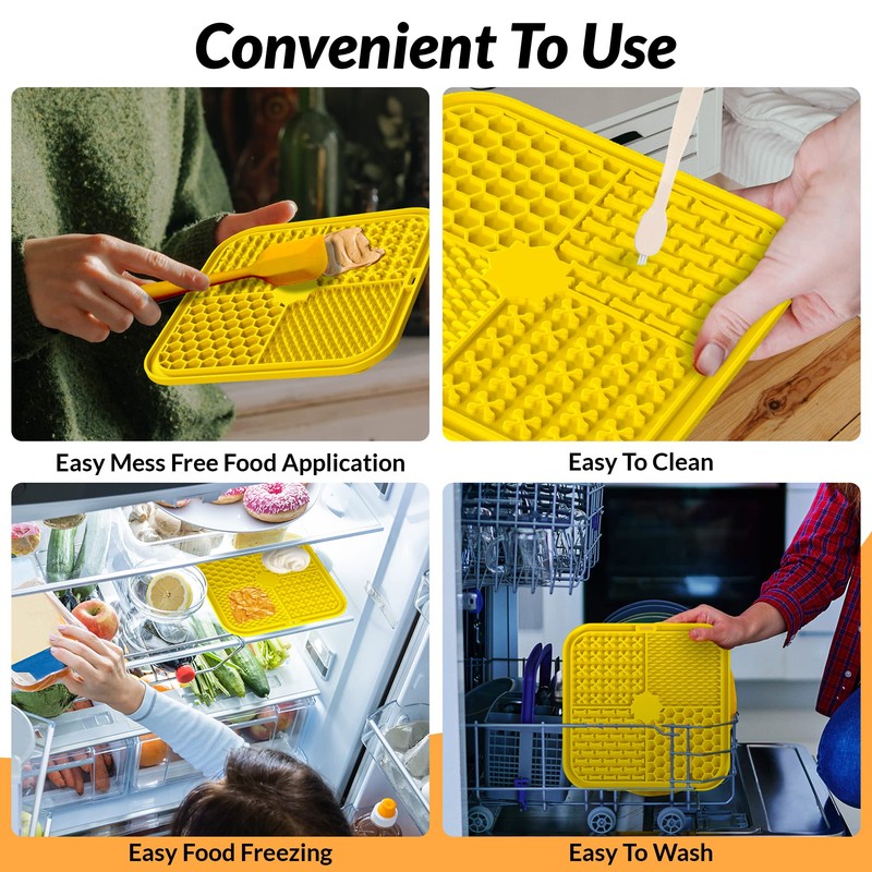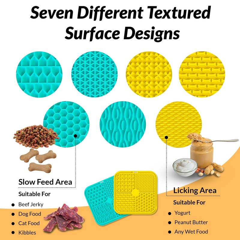 - [Entertain Pets]: The Dog Treat Mat for Bathing Grooming can be used as Dog Enrichment Toys for Boredom Reducer. The Licking Mat for Dog Anxiety Relief will keep cats and dogs busy. The slow feeder will calm them down.
