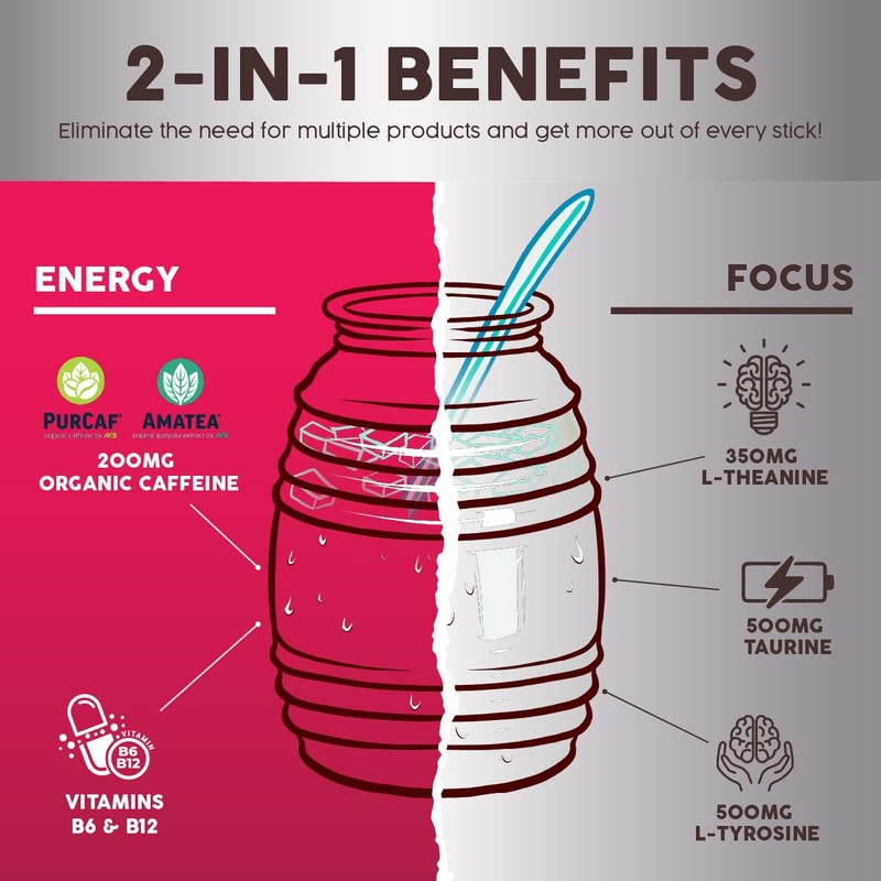 - 2-in-1 ENERGY & FOCUS - Eliminate the need for multiple products with our on-the-go stick packs that are designed to provide you with clean and balanced energy with improved focus from carefully selected ingredients proven to deliver results.