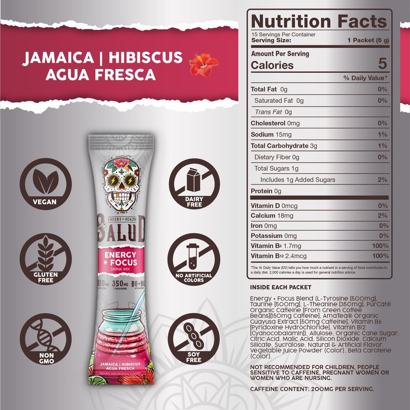 Salud 2-Pack |2-in-1 Energy + Focus (Hibiscus) & Hydration + Immunity (Tamarindo) C 15 Servings Each, Agua Fresca Drink Mix, Non-GMO, Gluten Free, Vegan, Low Calorie, 1g of Sugar