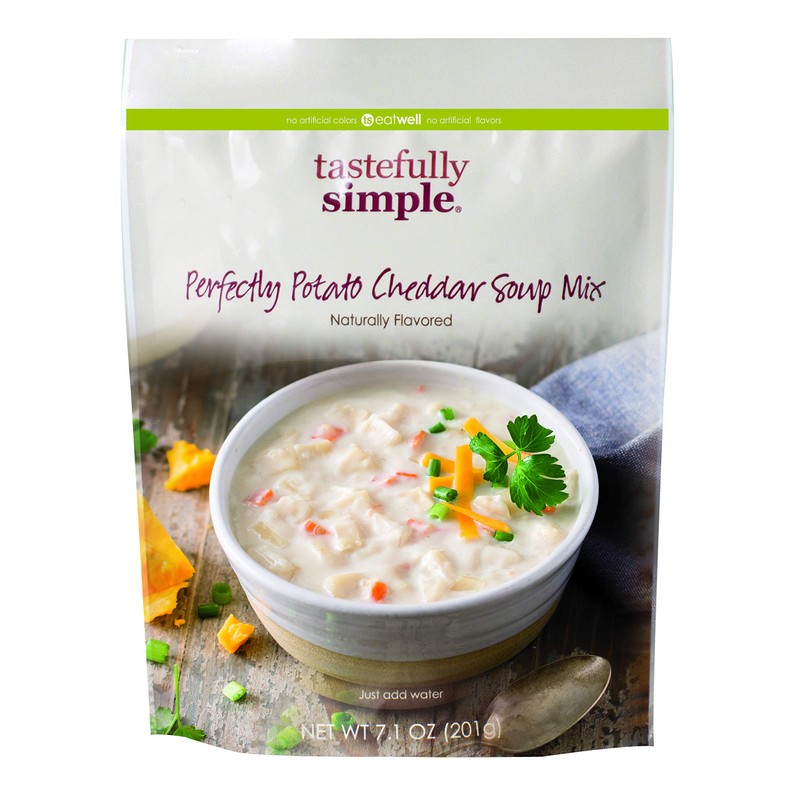 Take the chill off a long, cold day with the ultimate comfort food. Creamy Perfectly Potato Cheddar Soup Mix is a hearty eats-like-a-meal mixture of potatoes, Cheddar cheese and onions. Just add water to this simple mix for the family's new favorite delicious cheesy potato soup.
