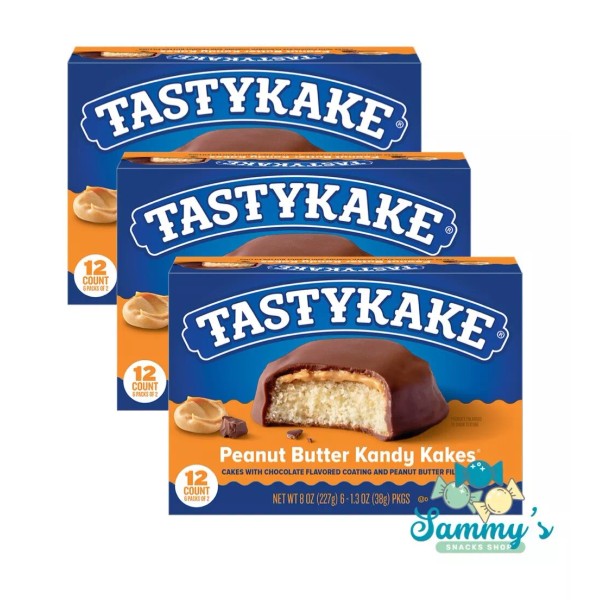 3 boxes of Tastykake Peanut Butter Kandy Kakes. Each box contains 6 packs of two kandy kakes for a total of 12 kakes per box.