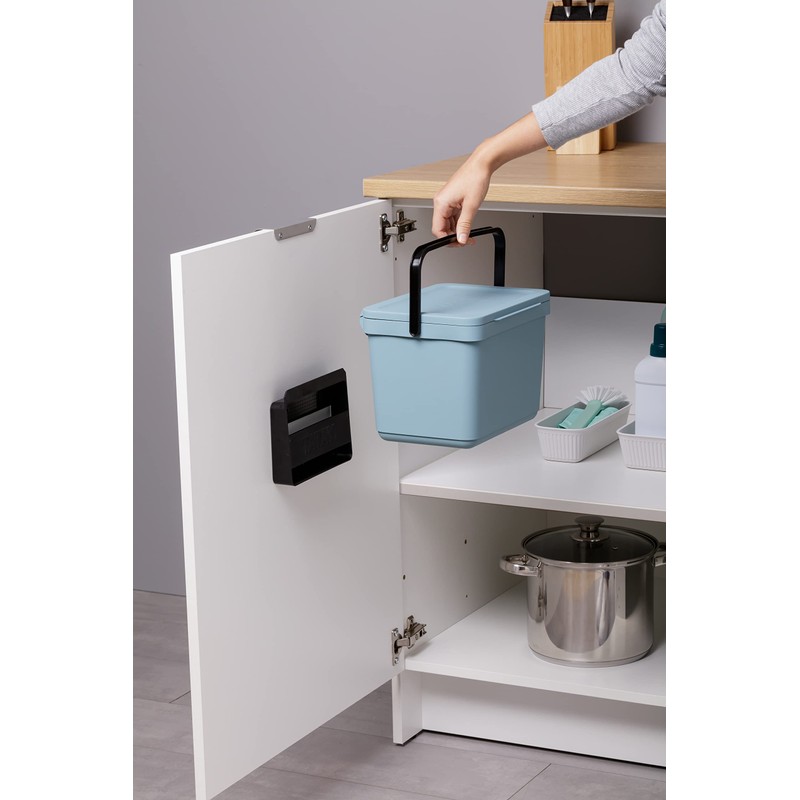 - Practical and modern design: compost container with lid and handle; suitable for organic waste, coffee capsules or other kitchen waste. Can be hung on the door thanks to its ABS carrier. Thanks to its design, the lid remains open and makes it easier to tip out the food.