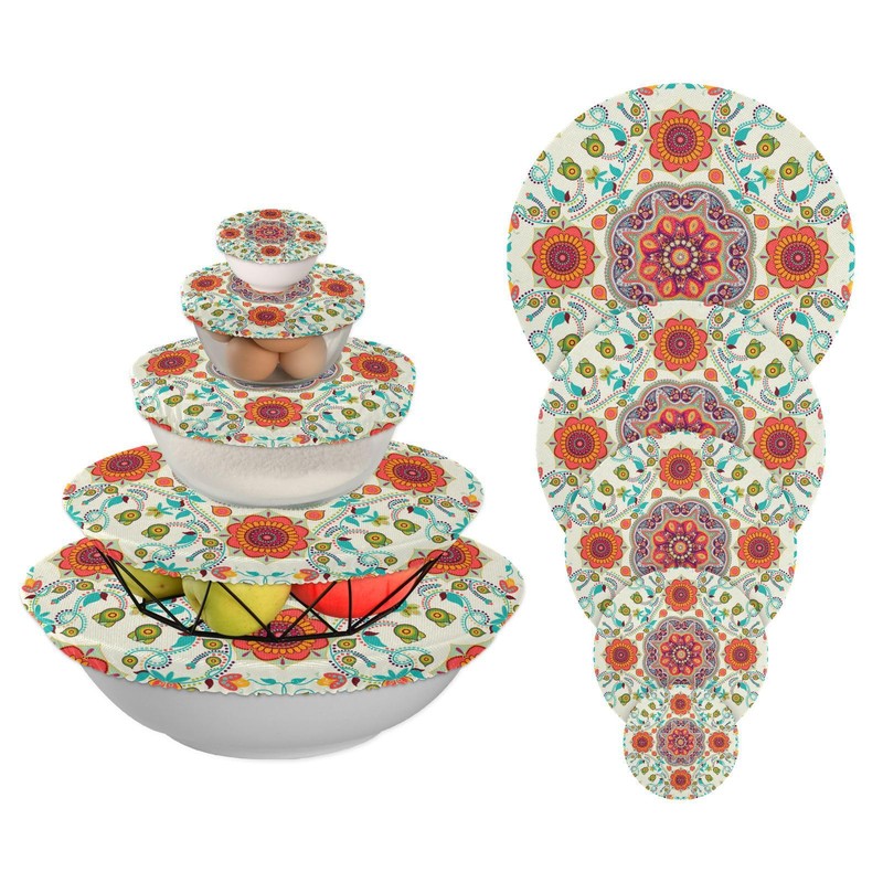 Tatenale 5Pcs Cloth Bowl Covers Reusable in 5 Size Elastic Bowl Covers Polyester Fabric Stretch Washable Food Storage Cover for Fruit Picnic Bread Proofing Orange Mandala