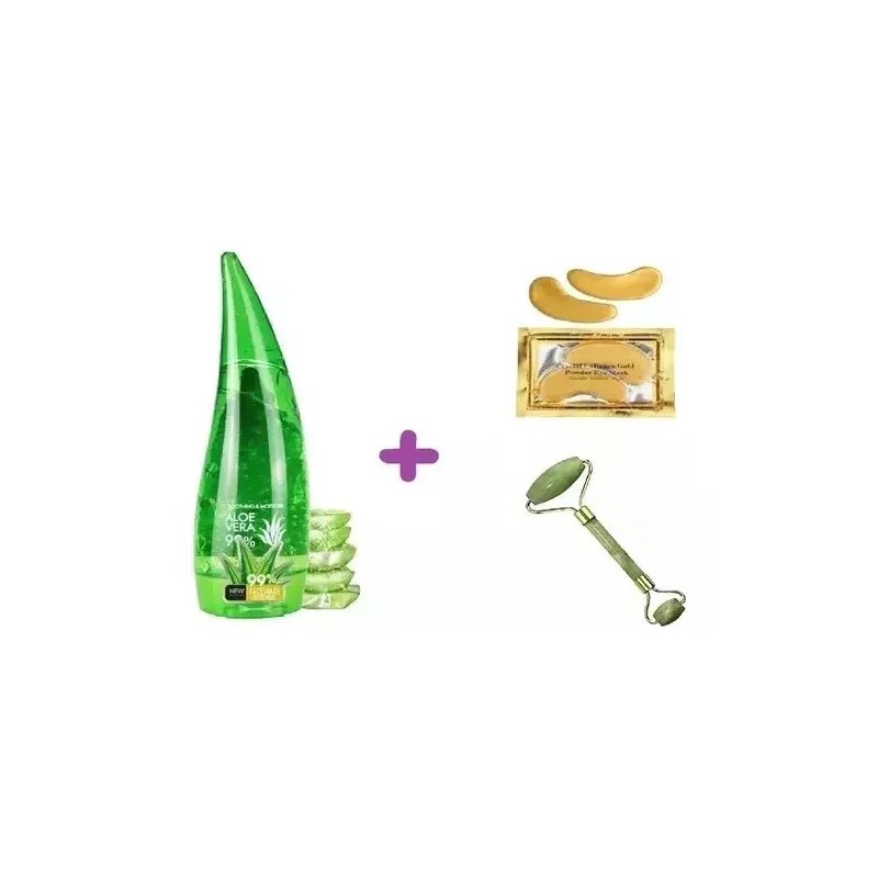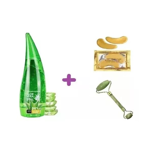 Aloe Vera Sabila Gel Facial Cicatriz Blanqueamiento + 5 Parches Para Ojeras de Colageno + Rodillo De Jade Masajeador Facial