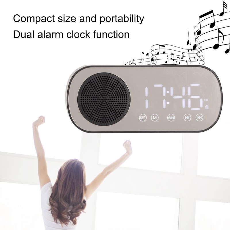 - ⏰Portable Design---Bedroom Clock with Bluetooth Speaker. The compact size and portability make it the perfect portable radio for indoor and outdoor use, ideal for reading, cooking, horse riding, sports or travel. Further, the dual alarm clock function allows you to set two different alarm clocks, allowing you to wake up in the morning and see the time clearly.