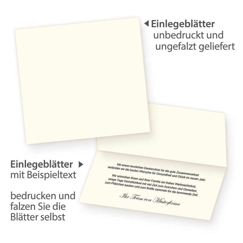 - You can print the insert sheet of these Christmas cards yourself or write on it by hand, then you can fold the insert sheet and fix it in the Christmas card with the included gold ribbons. With the accompanying envelopes, you have created such a beautiful Christmas post yourself.