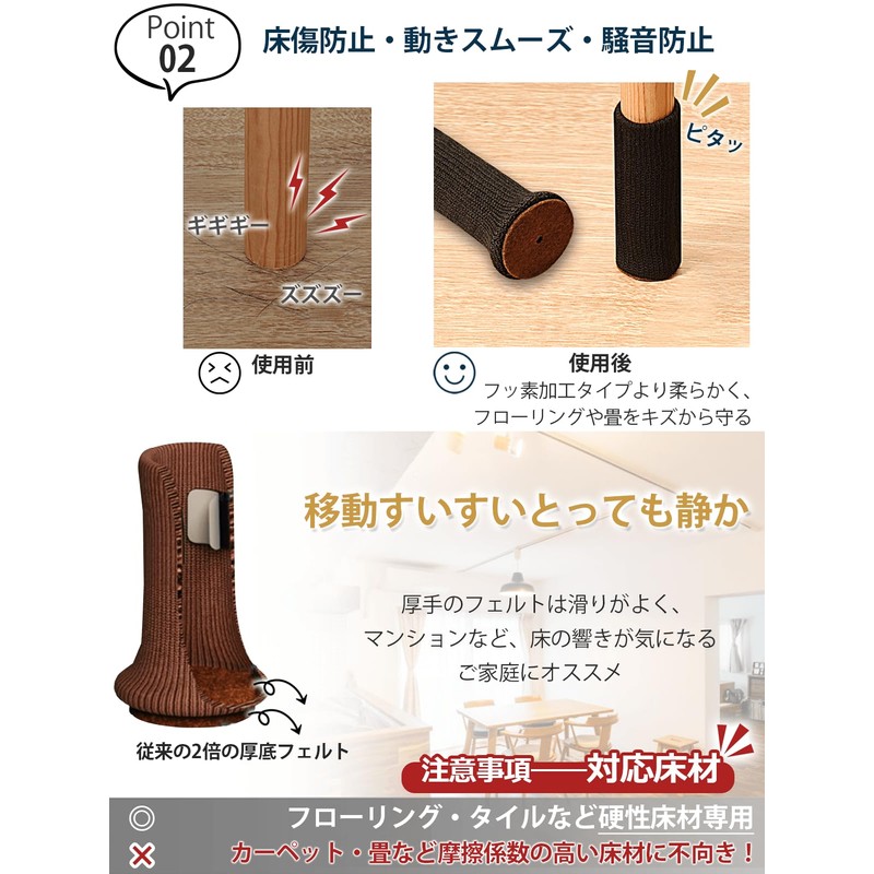- (Anti-Scratch Floor, Smooth Movement, and Noise Prevention) 1. To protect the floor, we have improved the bottom felt of about twice as thick as conventional felt. Protect your flooring from scratches by simply placing it on the chair legs. 2. The thick felt is slippery, moving very quiet, and it is recommended for homes such as apartments and other homes that are concerned about the sound of the floor