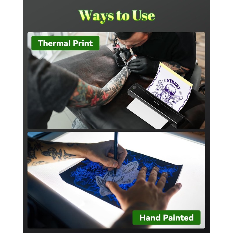 - TWO WAYS OF USE TATTMUSE tattoo transfer paper is compatible with TATTMUSE A887, PeriPage P90, MUNBYN ITP05, Itari A886, Phomemo M08F, TP81, TP83, TP86, TP87, TP88, TATOPRT P19, BESTECCT PTP20 and a variety of Thermo-T . Or draw the original pattern directly with your hand