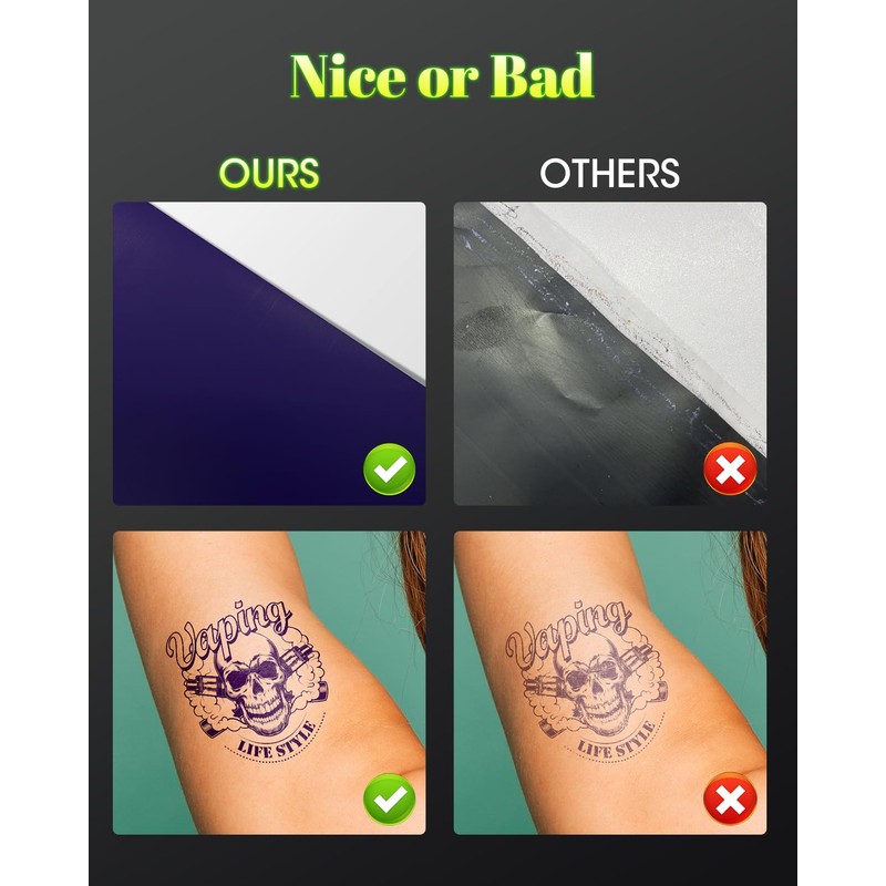 - TATTMUSE Tattoo transfer paper - paper size: A4 (210 mm x 297 mm), quantity: 100 sheets. Made from high-quality dyes and stencil paper, TATTMUSE tattoo transfer paper ensures clear, clean and pale resistant transfers. Tattoo paper is ideal for tattoo enthusiasts, artists and professional tattoo artists