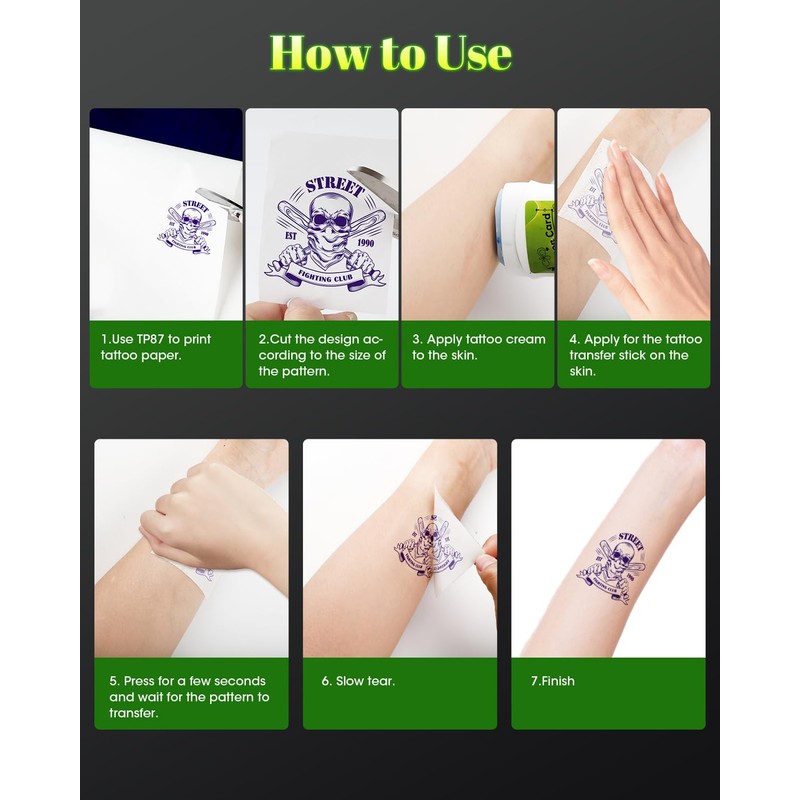 - Tips: TATTMUSE tattoo transfer paper must be used with transfer media. You need to buy the transfer ointment separately. If the transfer is incorrect, you can wipe the transmission traces with alcohol.