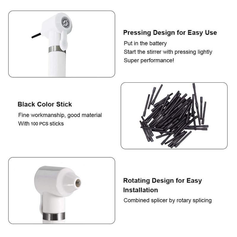 - Perfect colour mixing set: the package contains 1 white colour mixer, 100 black mixing sticks, which can be used to mix tattoo paint, watercolour ink, paint, make-up liquid, etc. The tattoo paint mixer is powered by two 1.5V AA batteries (not included).