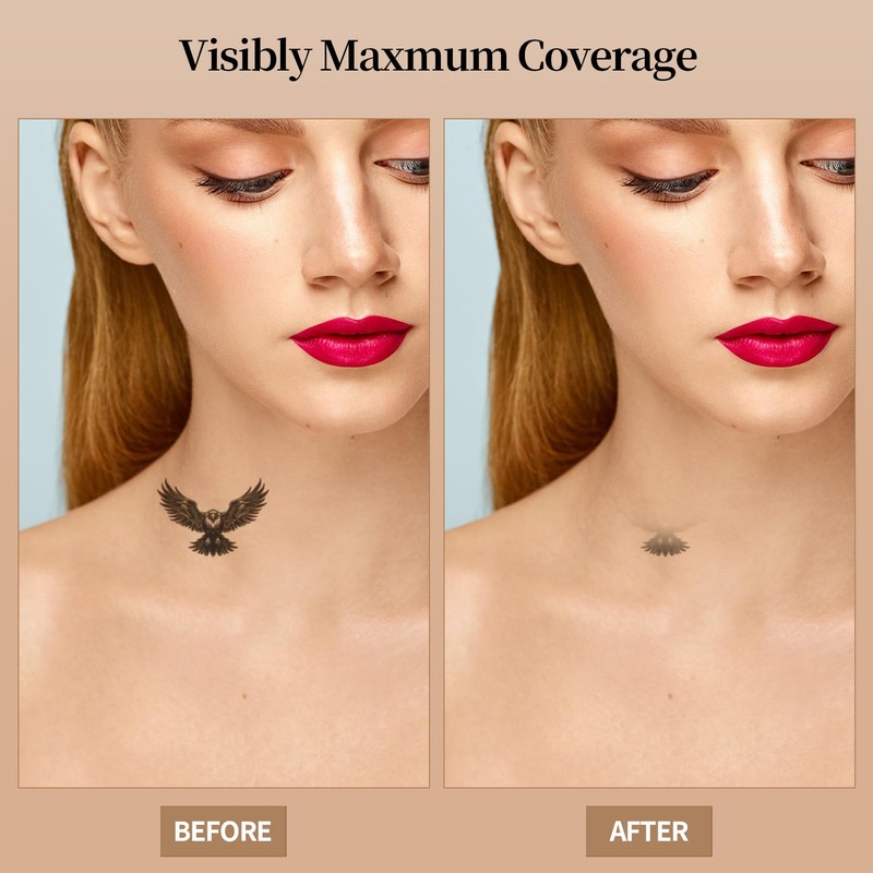 - TATTOO & FLAW ERASER : Specially formulated to camouflage tattoos, dark circles, acne scars, and hyperpigmentation with buildable full coverage. Achieve a seamless, natural finish that lasts all day—no touch-ups needed