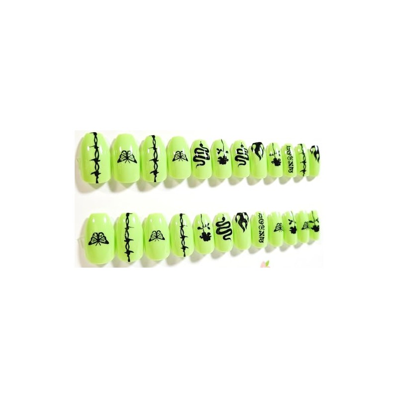 - These fun, glossy nails feature neon green base nail with a black tatoo design on every nail. Short length means all day, natural, functional wear without any hassle.
